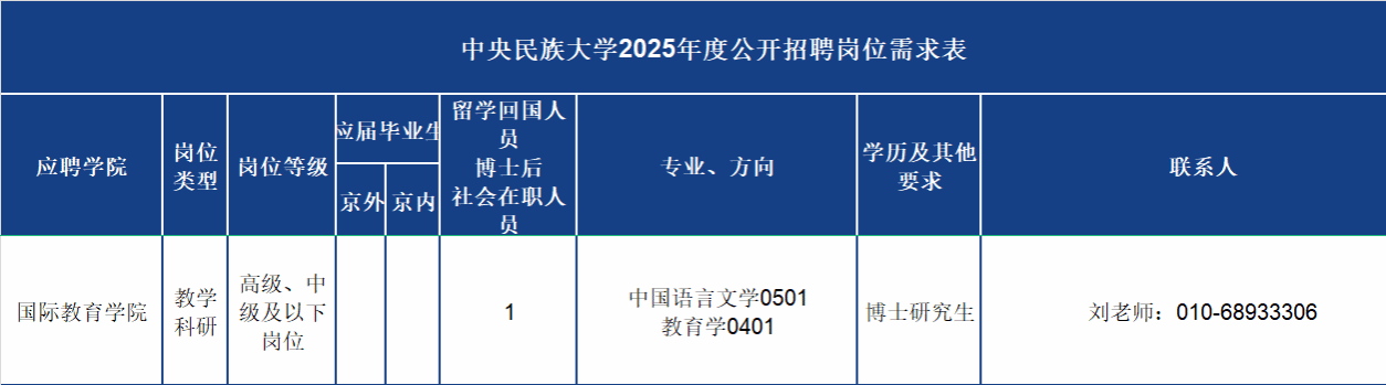 是国家民委、教育部、北京市共建高校。学校前身为1941年成立的延安民族学院,1999年、2004年学校先后进入国家“211工程”和“985工程”,2017年进入“双一流”建设A类高校行列。为进一步加强学院人才队伍建设,优化师资队伍结构,根据学校招聘工作安排,Cool18